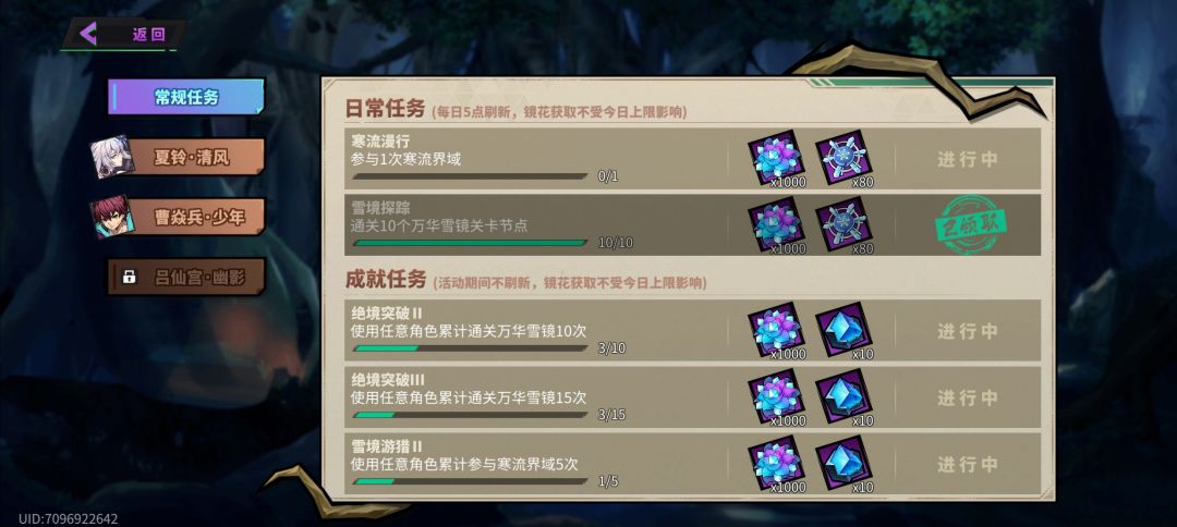 这次活动从系统给你四个10万战力满技能满武器精炼的角色,四选一进行通关(一开始只能用少年曹,后续角色需要购买解锁)。