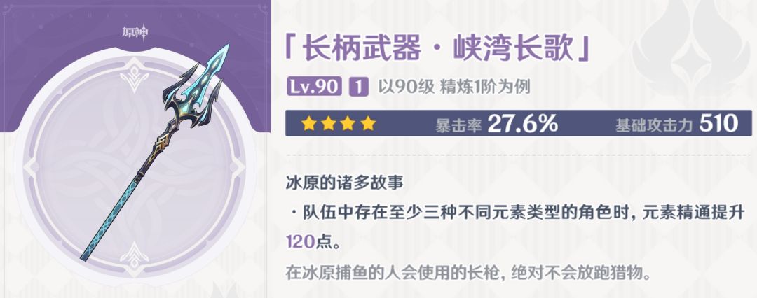 长枪,峡湾长歌。武器特效简单粗暴,提供高额元素精通加成,满精可以提供240点元素精通,并且副属性还是高贵的暴击。因此,这把武器适合胡桃、赛诺和香菱。