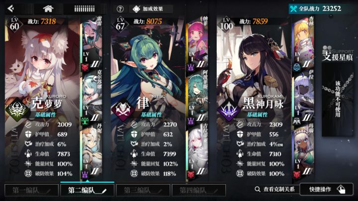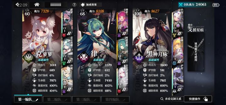 编队二是针对三星困难的全治疗编队,困难五六里,各种反伤,禁疗,必中,超高伤害,导致想要三星通关要么战力压制,要么跟我一样,苟过去,那么一破雷雷,克尔苏那和杏林就是必须的。