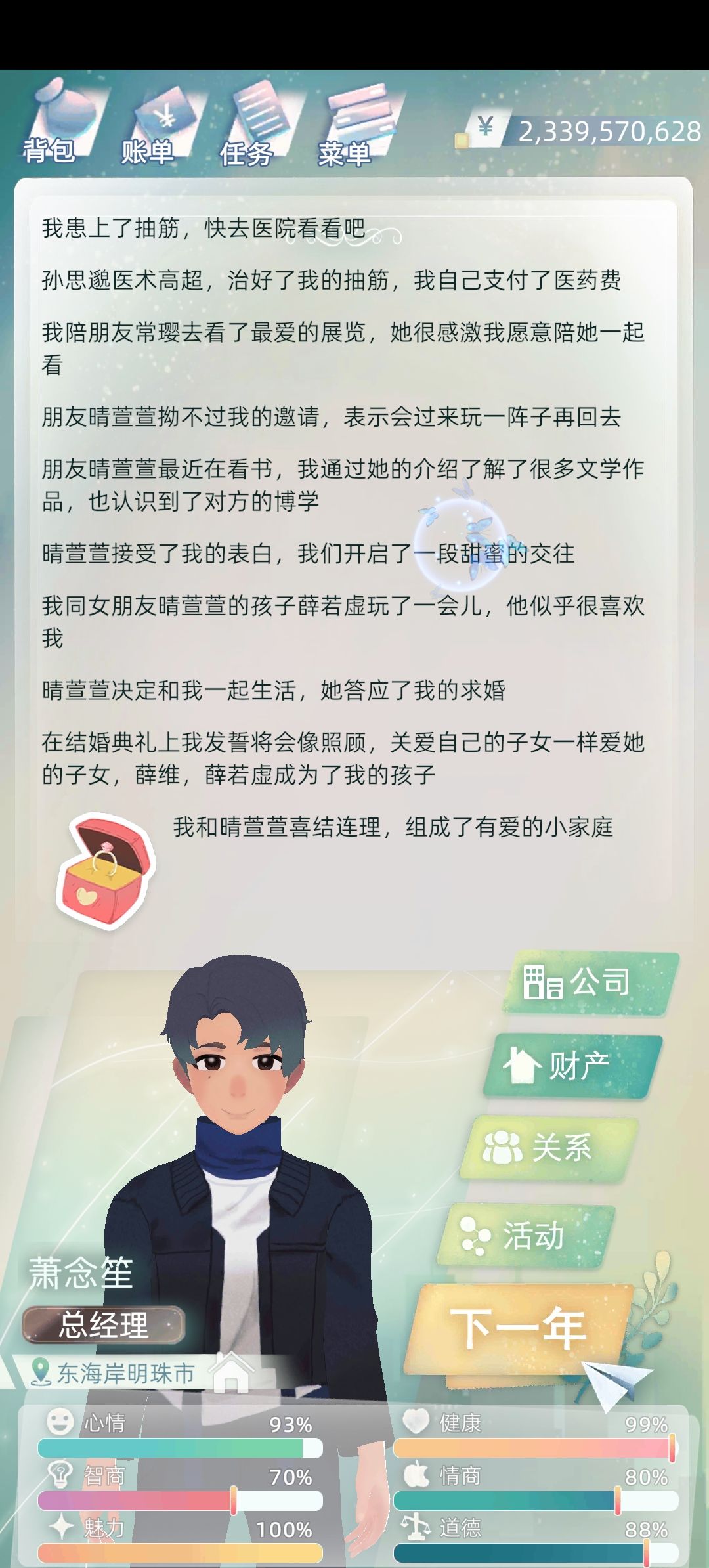 拿着妈妈的钱我开了一家公司,虽然我每年都在忙碌的管理着底下的员工,但是从来不忘记刷她的好感度,每年都会和她打电话。26岁那年,她离异了带一儿一女,也许是年少时的不甘心,我向她表白了,她连拒绝都没有,不仅答应了我的表白还搬来了我的城市,和她谈恋爱我甚至可以逗一逗她和她前夫的女儿和儿子,这让我产生了落差感,这些年没有得到她,我把她想的太过美好,如今幸福来得太突然,我却有点无力承受,和她谈恋爱没到一年我们就闪婚了,也拥有了属于我和她的爱情结晶,但当我发现她和她前夫的一双儿女对我的好感度非常低的时候,我黑化了,和她吵了这辈子最不应该吵的架,我们最终离婚了,她带着刚生下的儿子离开了我的世界,而我也因此抑郁而终。