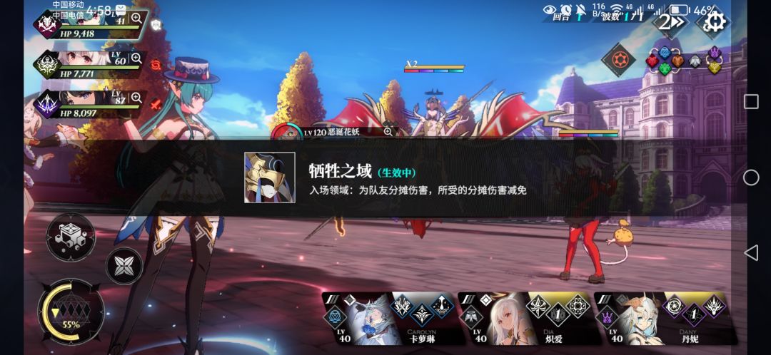首先是领域,一场战斗最多生效一个领域(可以没有),新的领域会替换旧的领域。如图,可以在右上角圆圈看到是否有领域,红色的代表是敌方领域,领域不被替换是一直生效的,所以一般我们需要快速替换掉敌方的领域,。