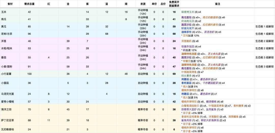 需要购买食材的食物成本 400~3000 不等,除了用来解锁烹饪笔记喜欢/特别喜欢的格子,其余留到 30 级后解锁贸易站用来交订单赚钱。