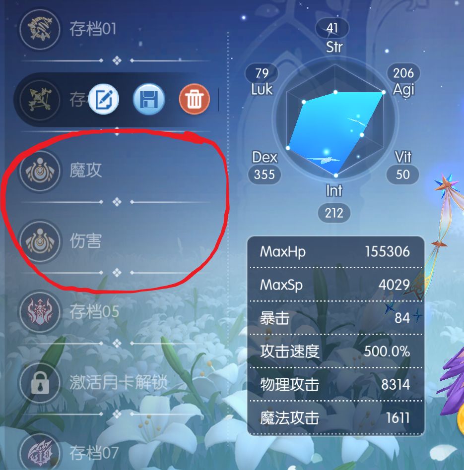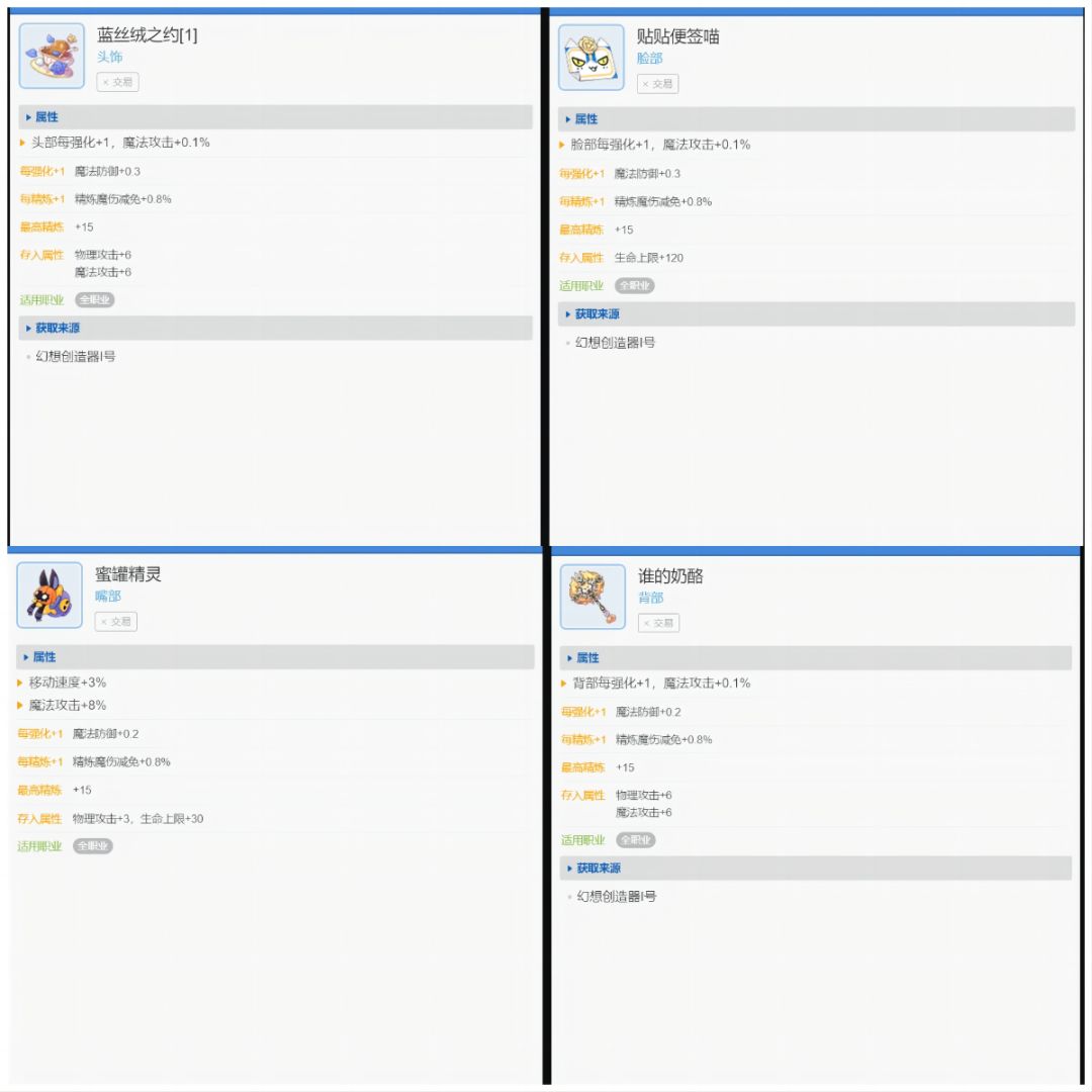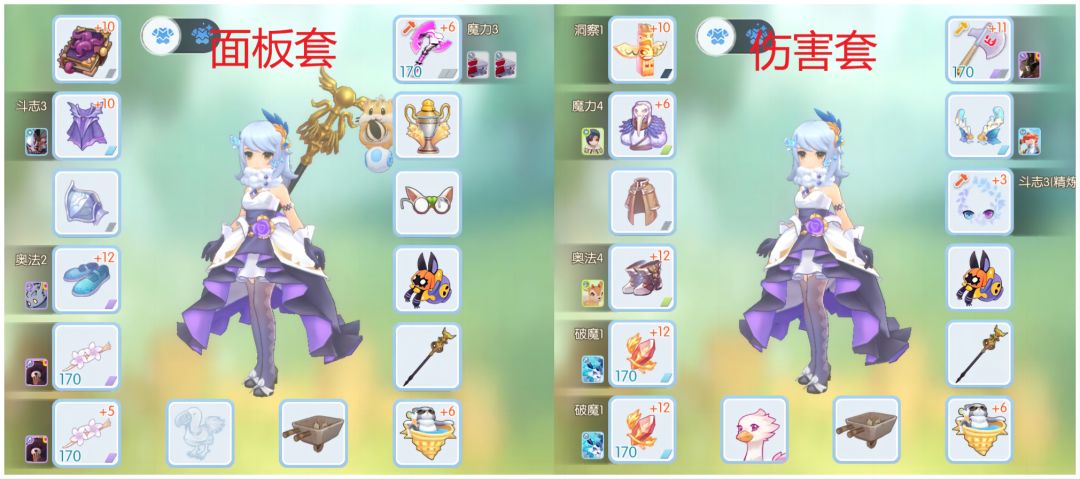 面板套和伤害套如下图,面板套远古词条全部要魔法攻击力,越高越好,右侧头饰由于是小号,实在是挑挑选选在有的头饰里找了些加面板的,没必要参考。之前的扭蛋里有那些强化到170加17%面板的头饰非常适合用作面板套,没有的就在手册里找些加面板的凑上就行。