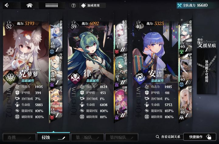 我现在就侵蚀单核,多带破盾。话说丹妮挺强的,配律,后期很多怪开局就开场地,丹妮直接全体必定减怒气,配合律,连携伤害还是不错的。第二回合安洁再开场地,又刷新了。