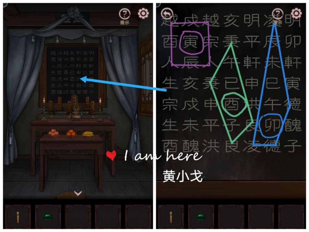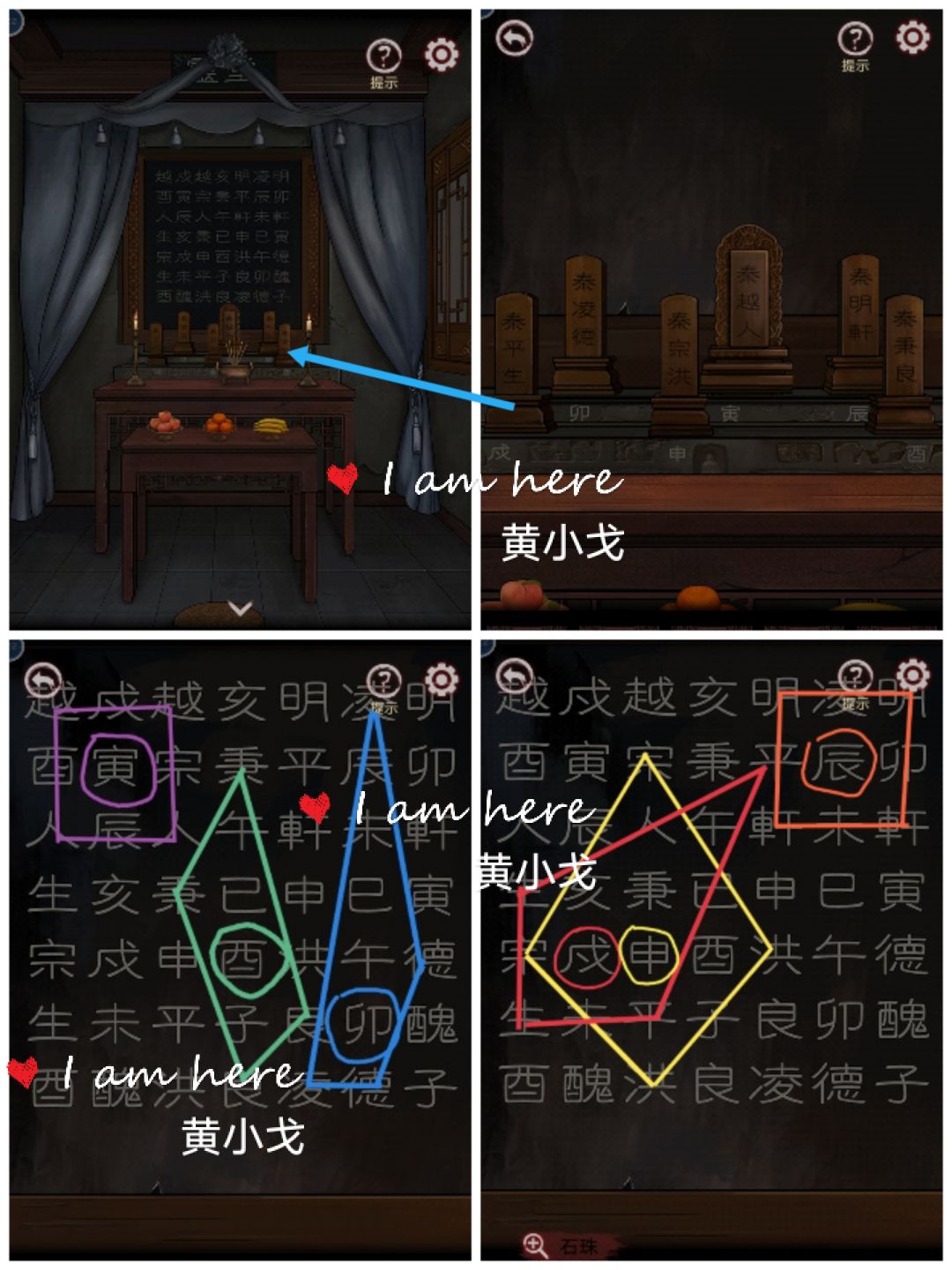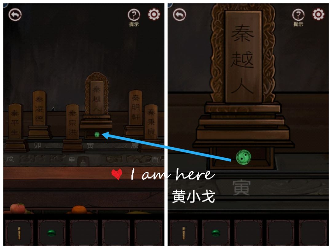 16.点击灵牌,其中秦越人-寅是固定的,结合碑上的字,获得解谜思路,调整灵牌的位置(秦秉良-酉、秦明轩-辰、秦宗洪-申、秦平生-戍、秦凌德-卯)
