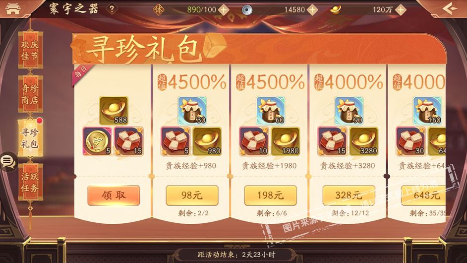 活动期间通过成长任务和充值礼包可获得限时抽奖道具“寻珍币”,可用于秘宝寻珍抽奖。