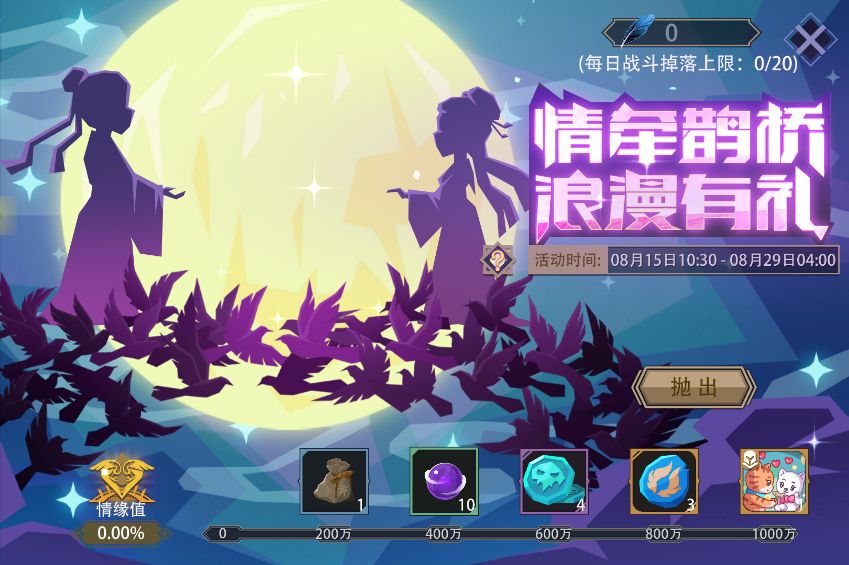 活动内容:活动期间,在[冒险模式]/[冒险试炼场]/[梦魇模式]下击败每一层的“首领”必定会掉落随机数量的“鹊羽”,点击“抛出”按钮会消耗当前全部的“鹊羽”并获得魔晶奖励,同时还会随机增加全服情缘值。当累计情缘值达到下方进度条所示数量,全服玩家还能获得额外的进度奖励(包含“限定七夕节头像”[甜蜜小猫])。