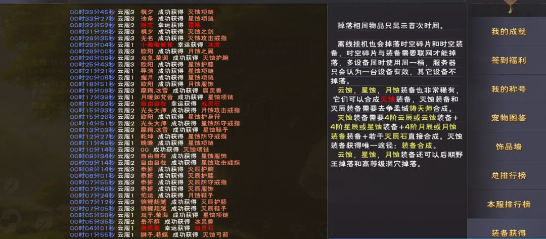 这个可不能忘,人家就是脸白,人家就是不需要费力合成4阶云辰装备,星辰装备,月辰装备!人家一打怪,怪就掉了个老厉害的装备了,对这就是蚀装。掉落云蚀不全服通知,掉落星蚀月蚀装备就全服通知,并上公告墙。