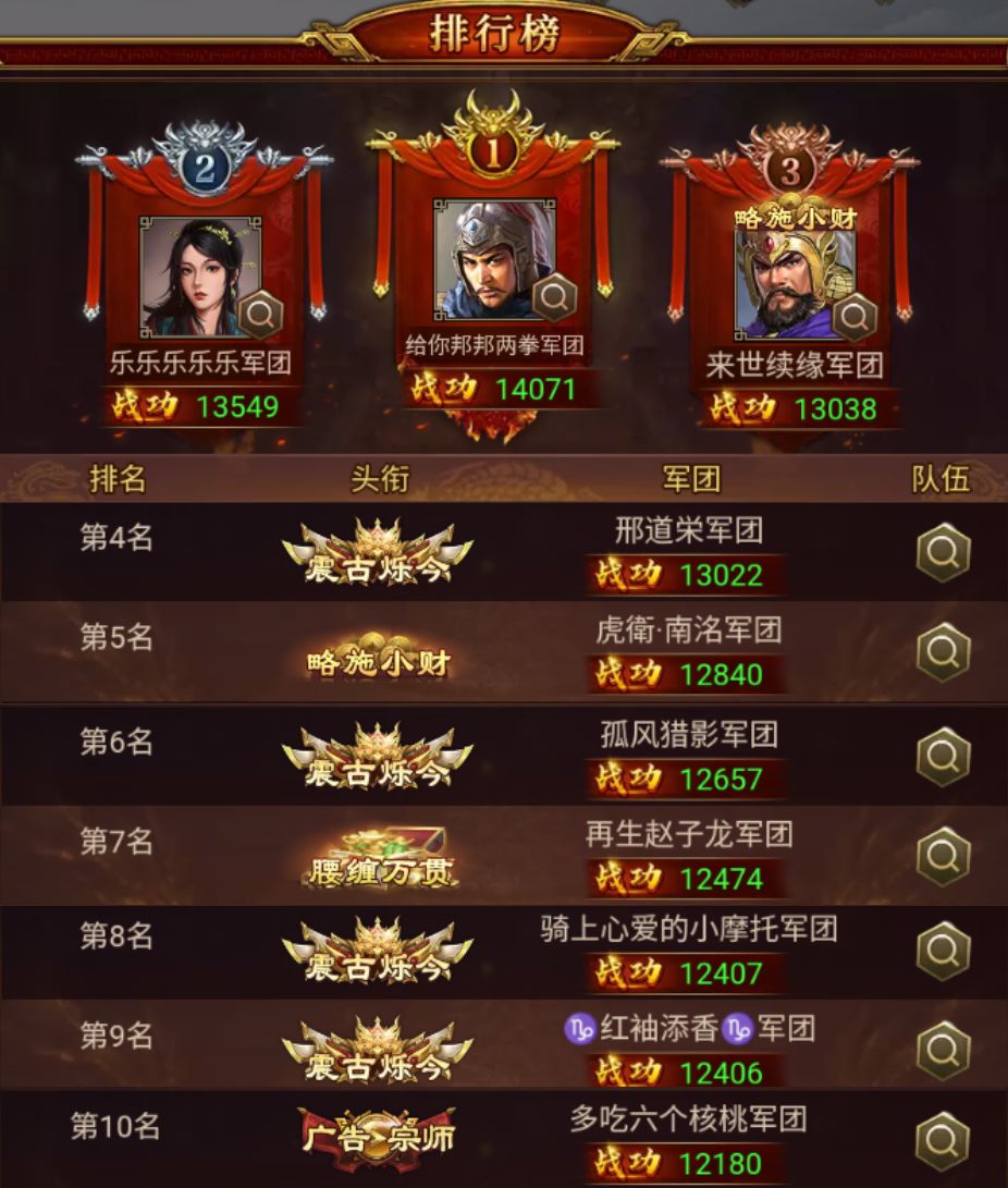 成功荣登首期濮阳之战榜首的是 给你邦邦两拳 军团,率先以 14071 的战功拿到目前濮阳最高分,非常厉害!