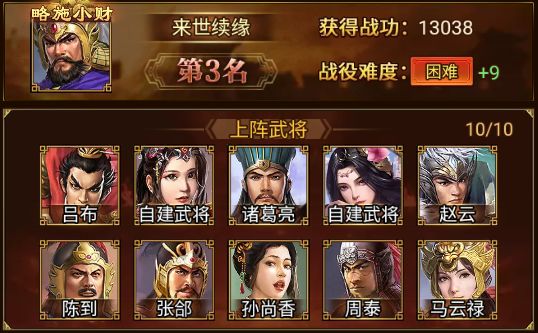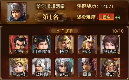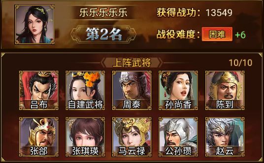 吕布、周泰、孙尚香、陈到、张郃、张琪瑛、马云禄、公孙瓒、赵云和一位自建武将
