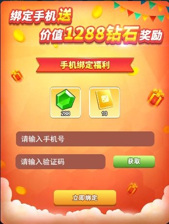 赠送手机绑定福利赠送钻石*288,高级召唤券*10。