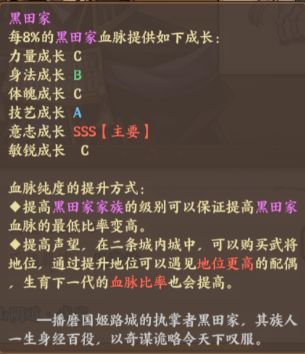 先来了解一下氏族血脉成长的侧重点。黑田氏主要侧重于力量的成长。