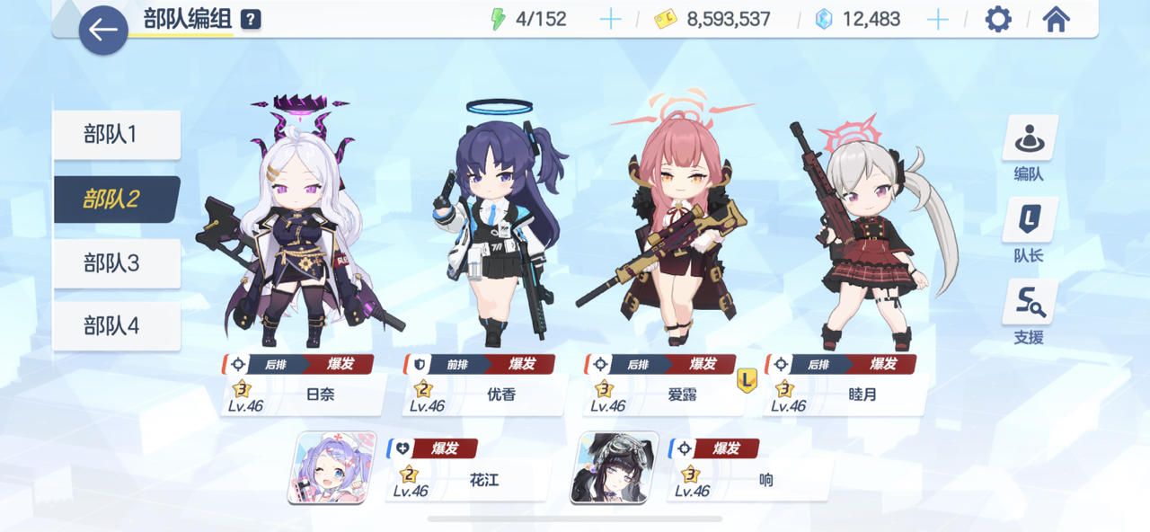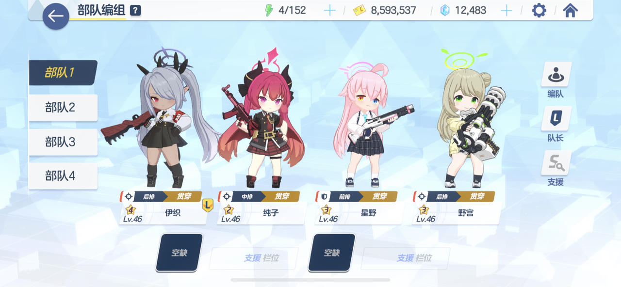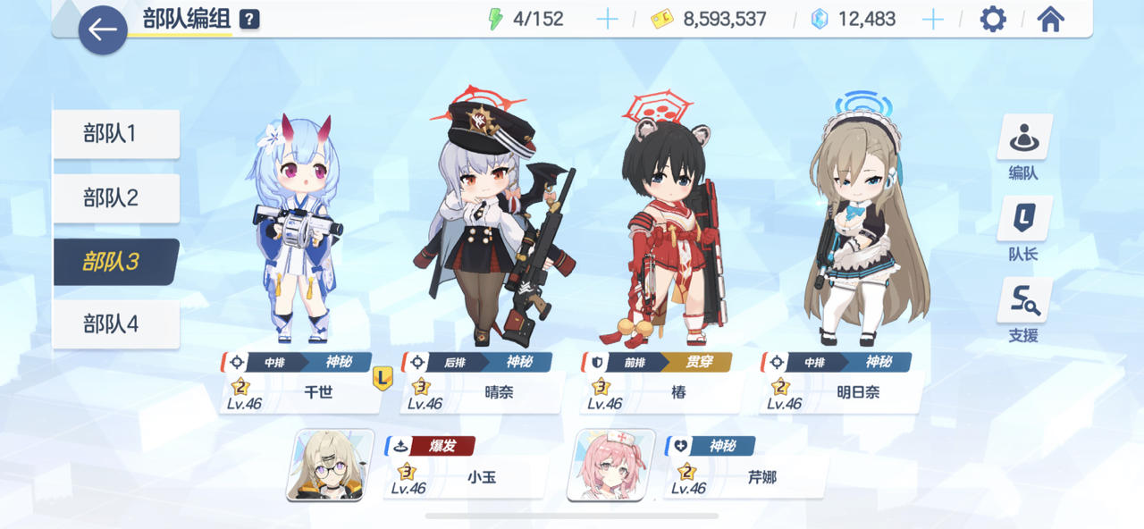 晴奈➕千世➕女仆➕盾,这里盾建议选狗盾,后排支援小护士+辅助,这里我推荐小玉。为啥单独来讲,因为后面关卡神秘队是3星主力军,12-5boss懂得都懂,而且神秘队挺考验手操,比如晴奈的贯穿没操作好空枪,千世的范围不算大,最边缘还容易没有伤害,女仆需要打断前摇类似于大小姐,很喜欢莽,并且极其容易暴毙