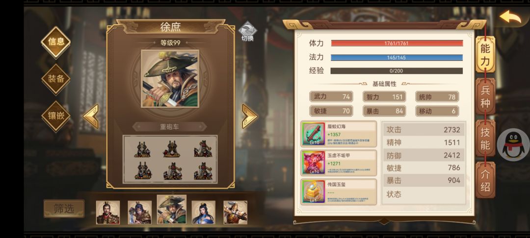 1.炮车徐庶,增伤套装,带1幻海玉1于禁魂。可以多削一下精神。开局放全屏军神