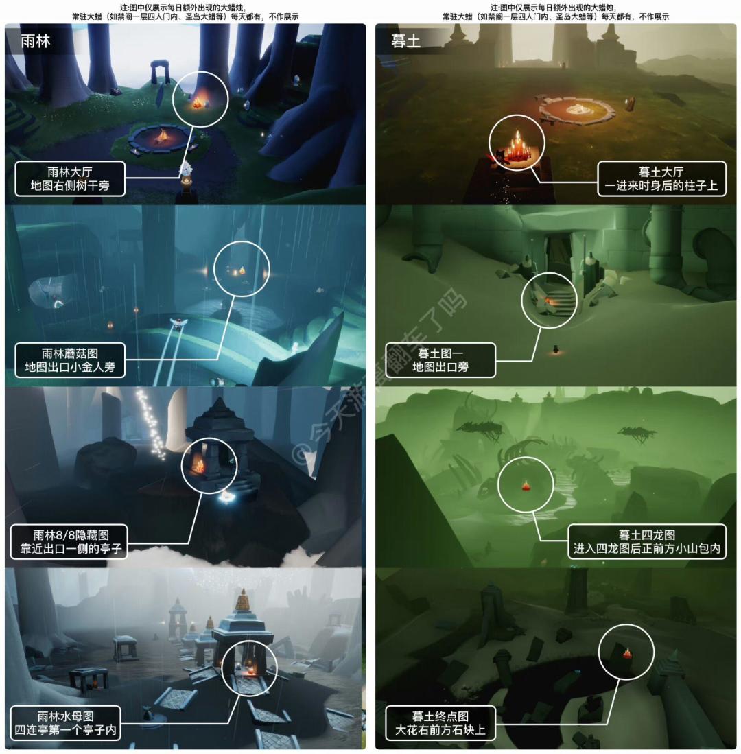 《光遇》游戏中每天的每日任务及大蜡烛的位置都不相同,玩家完成每日任务及收集大蜡烛都可以得到丰厚的兑换奖励,奖励可以用于兑换各种动作及道具,不过很多小伙伴不知道每日任务怎么做,又懒得自己去找大蜡烛的位置,我们汇总了每日任务的完成攻略以及蜡烛位置,一起来看看吧!