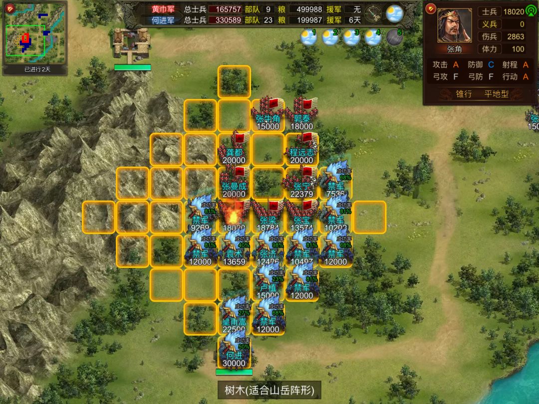 因为此剧本张角三兄弟都自带“黄天”,我们正是要利用黄天的aoe伤害在一回合内击杀掉十万敌军从而轻松快速的来完成任务。进入战场,如图:……