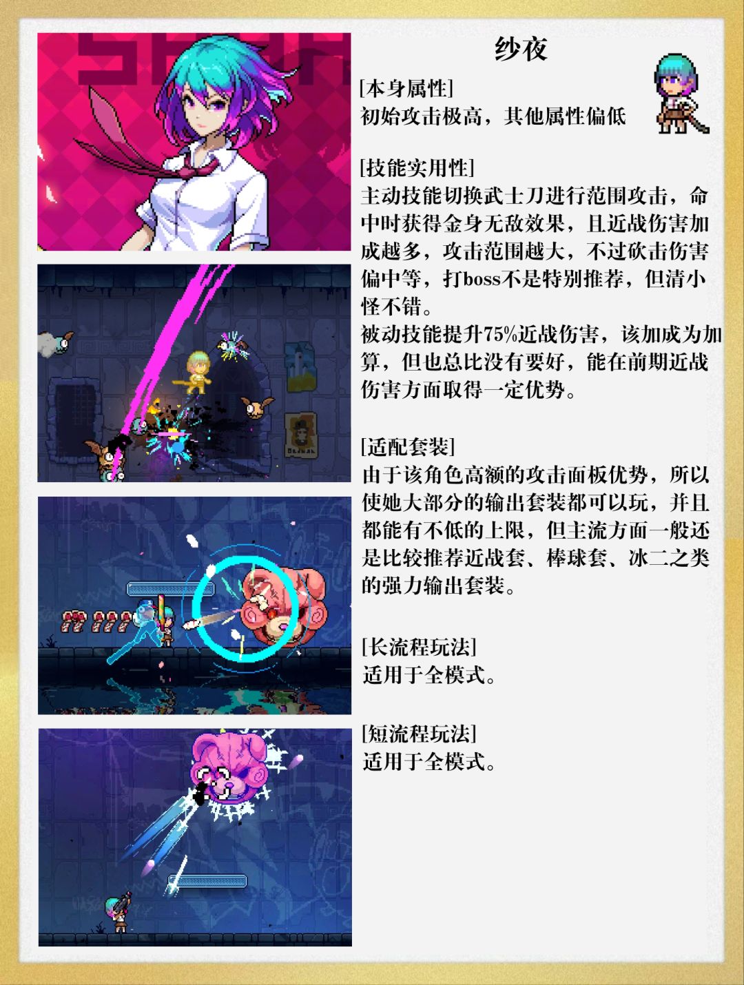 纱夜,近战美少女,用过都说好。技能能够提供突进效果,赶路快人一步。拥有最高的攻击力面板,近战套棒球套都有出色的表现,来一起用美少女斩杀小怪兽吧。
