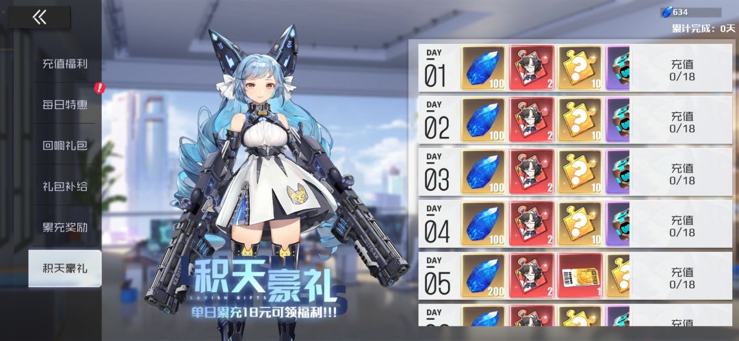 当然,作为手游,充值功能不能少,不充值可以玩的手游谁会去玩呢?对吧,这个游戏很贴心的放置了一整排的充值活动,日充值礼包,月充值礼包,周充值礼包,累积充值礼包,每日满充值礼包等等等等,彰显人性化,这里我还得夸一夸这个日充值礼包,非常人性化,每日充值礼包有3个,1元,6元,12元,一次全部购买只需要18元哦,巨大折扣,而且充值18就可以领取每日满充值礼包,多划算啊!