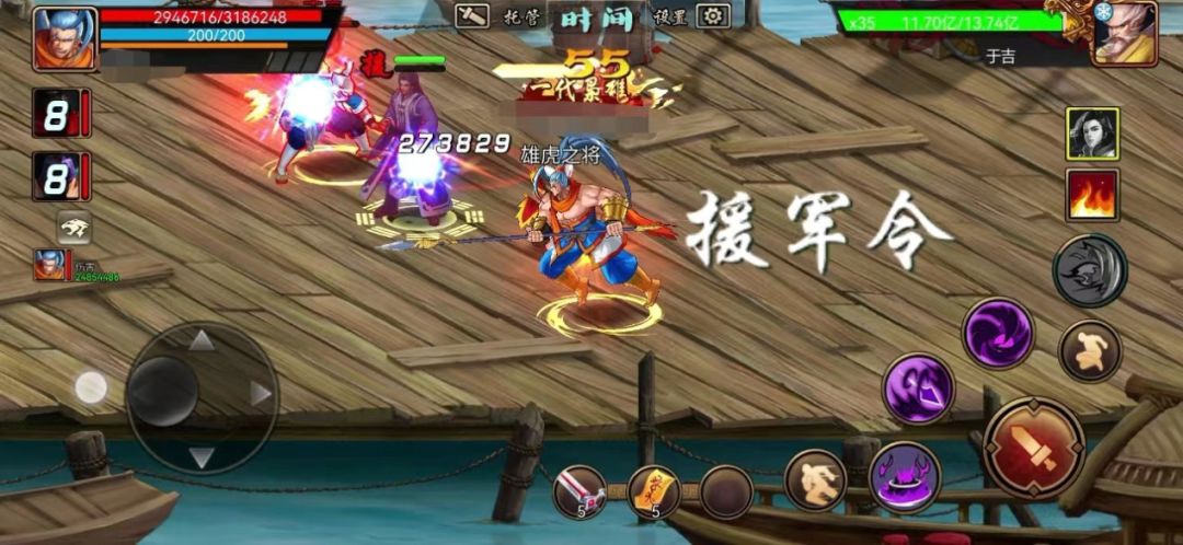 保镖打手形容援军很贴切,援军出场能吸收守关兵怪攻击,为主公提供安全的输出环境,普攻biubiubiu和怒气回复后的技能输出,打手的职责尽显。进入战斗后点击援军头像召唤援军上场,此时援军自动使用普攻进行战斗,若该援军已经解锁特殊技能则会立即消耗怒气值并释放特技攻击,不过特技具有一定的随机性,不像普攻攻击随时释放,技能需要等到怒气恢复后将继续自动使用特殊技能进行循环战斗,不像天书强力技能可以自由把控,援军中自带范围攻击的特技更吃香,如果后续援军技能也能玩家自主选择攻击,那就更完美了。