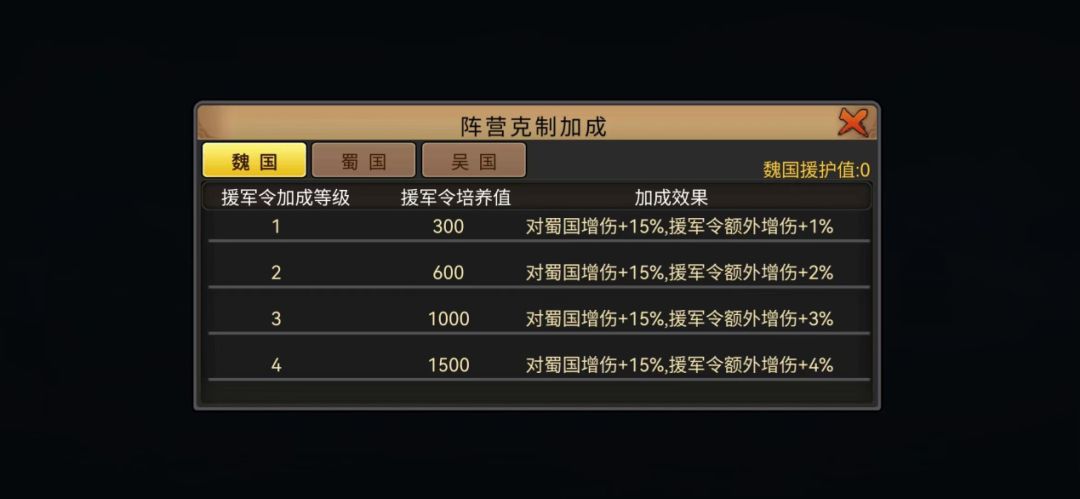 援军武将有效吸收了守关boss的攻击,普攻和3星解锁的技能输出起到了增强整体伤害的效果,同时自带的援军令加成效果,同一阵营援军叠加的援护值越多,援军令加成等级就越高,当上阵武将和援军为同阵营时,可以获得最终伤害加成,主要体现在对克制阵营增伤+15%、援军令武将额外增伤×援军令加成等级%,其中最高可达阵营增伤+15%、援军令武将额外增伤20%。这一克制加成也为我们在攻城略地的挑战中提供了极强的增益辅助。