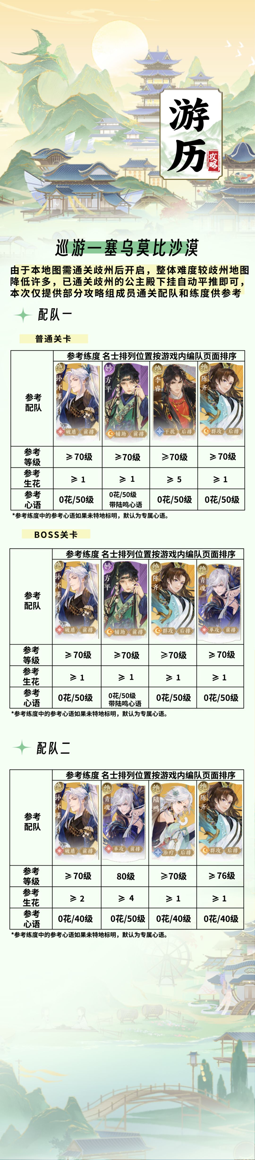 公主殿下日安,奉上新巡游地图【塞乌莫比沙漠】的打法攻略,配队打法思路不唯一,练度仅供参考,如有更好的配队打法,欢迎公主们在此条微博评论区分享。