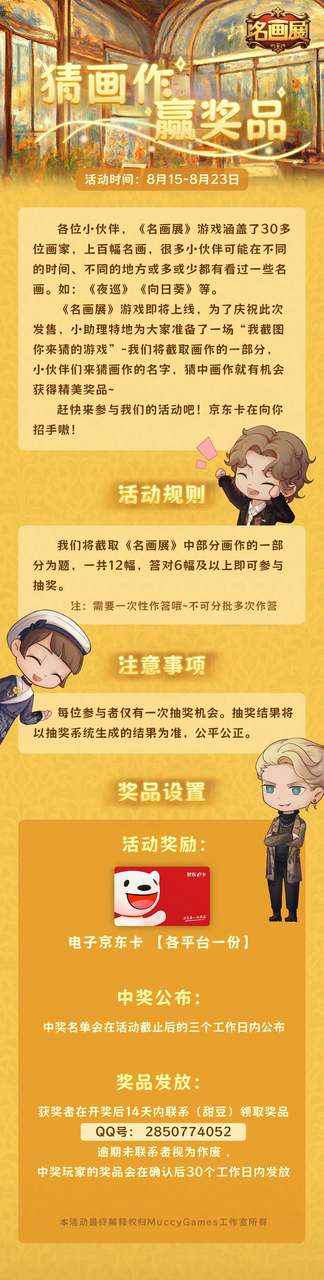 我们将截取《名画展》中部分画作的一部分为题,一共12题,答对6幅及以上即可参与抽奖