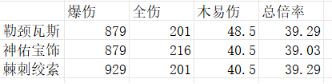 可知,8%木易伤好于15全伤,在爆伤低于879时,选择棘刺绞索,高于879时选择8%木易伤