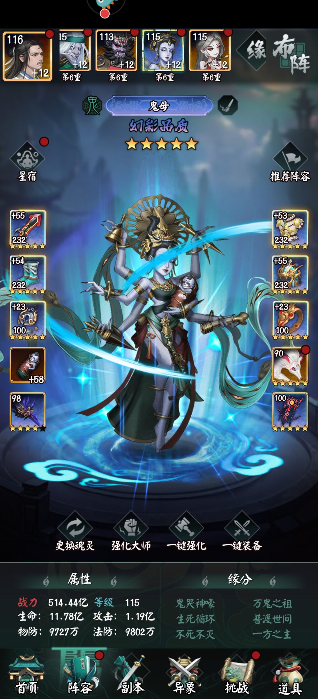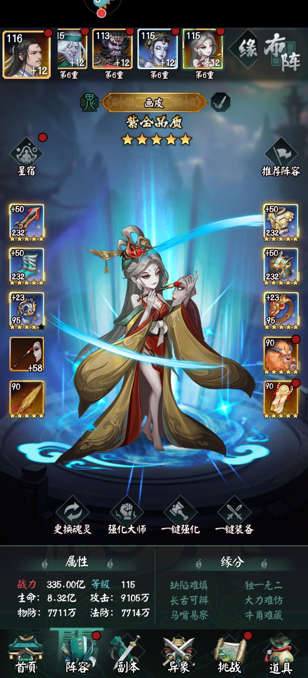 1/多攒紫金1魂灵,频繁的加怒气让核心输出多出手在PVE是非常重要的,毕竟PVE不需要考虑控制,防御等因素,只看攻击就可以。核心输出看情况,我是2核心+3紫金1辅助,有条件的大佬也可以试下1核心+4紫金1辅助,核心PVE只看攻击属性就可以了,血防属性在PVE下作用不大。截图里战力为今日截图,全鬼族阵容,实际刑天战斗时由于用紫金1替代了钟馗和孟婆,双核心战力应该各低10-20E左右,战力不具备参考价值,装备以及宠物的配置才是图中的关键参考点。