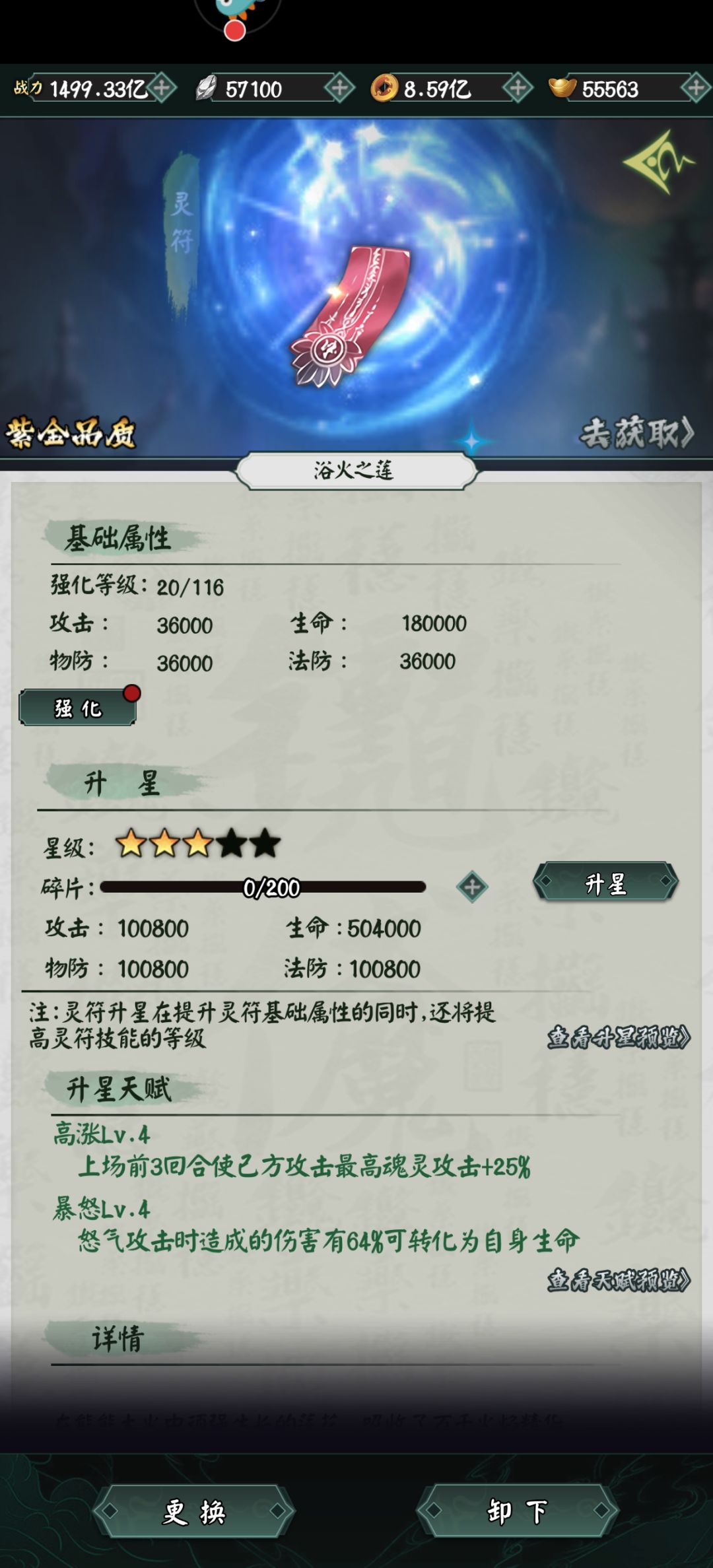 3/有条件的话强烈建议带浴火之莲这张紫金符(随便给谁带都可以生效,我是给主角带上了),我由于前期没有意识到它的强大所以才混到三星,这张符PVE增强输出以及PVP反制对手方面都非常强大(PVP后续如果还有空会再写一篇细说)。PVE中可以看到我这个3星就可以提供主C 25%的攻击加成3回合,这是个什么概念呢?大家都知道伤害公式是这样的(最终攻击)*(1+最终攻击加成百分比)*(1+增伤百分比),由于三者是乘法关系,且最终攻击数值一定,那么最终攻击这里增加25%就相当于总伤害增加25%,而同样的25%如果想要通过增伤来达成,假定你本身增伤为400%,那就需要多100%增伤才能实现最终伤害这25%加成。目前发现能加成最终攻击的途径只有灵符,这个符升到5星PVE下加成更是夸张。
