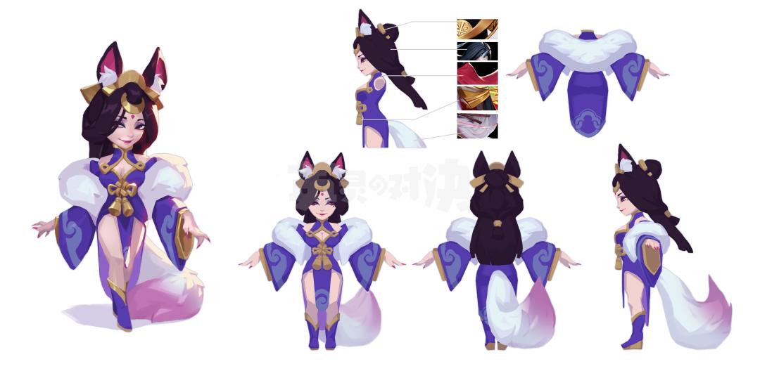 游戏中妲己参考了这一设定,通过紫色的大衣、金色的发簪表现出妲己尊贵又神秘的形象,衣服上白色的云雷纹增添了人物的神话色彩。
