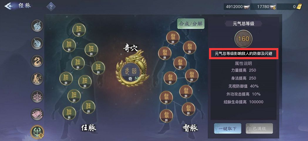 元气总和界面下方,有一键取下和一键升级功能。元气总等级还会影响敌人的防御和闪避,这算是经脉玩法的额外隐藏属性,具体数值暂时不会显示,但是元气等级越高,效果也就越明显。