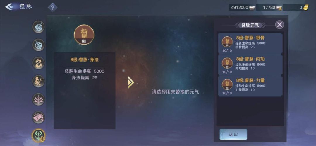 经脉系统是游戏中非常具有武侠特色的一个玩法,玩家可以用元气来合成各种经脉属性,然后镶嵌在经脉中,提升玩家的属性和战力。