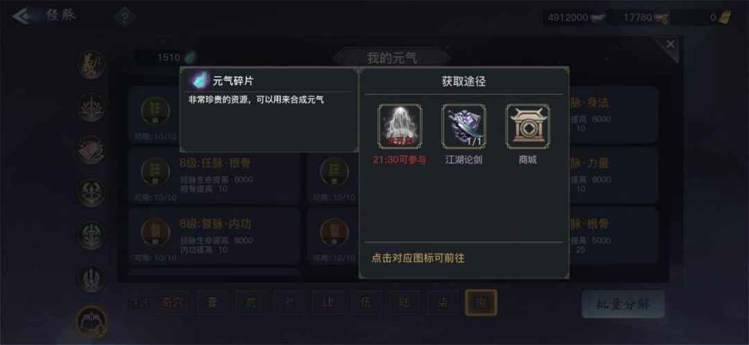 无论是任督二脉中的元气还是奇穴中的元气,都需要元气碎片来合成。元气碎片是游戏中非常珍贵的资源,在游戏中的获取途径有很多。