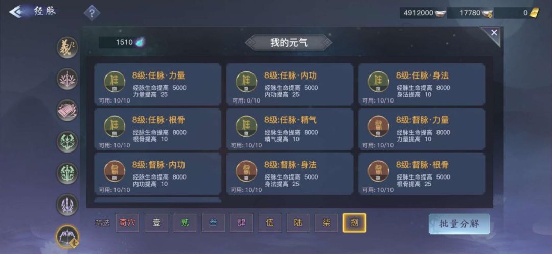 经脉中所有的任督二脉元气和奇穴元气,都可以合成/分解功能界面中进行,其中包含所有的元气等级,只要元气和银两够就可以合成。目前元气等级最低1级最高8级,等级越高增加的属性也就越多,每个元气都是增加一个属性外加经脉生命提高。