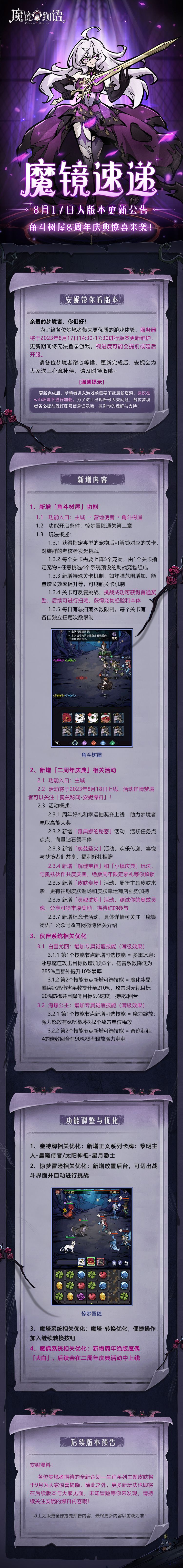 为了给各位梦境者带来更优质的游戏体验,服务器将于2023年8月17日14:30-17:30进行版本更新维护,更新期间将无法登录游戏,视进度可能会提前或延后开服。请各位梦境者耐心等候,更新完成后,会为大家送上心意补偿,请及时领取哦~