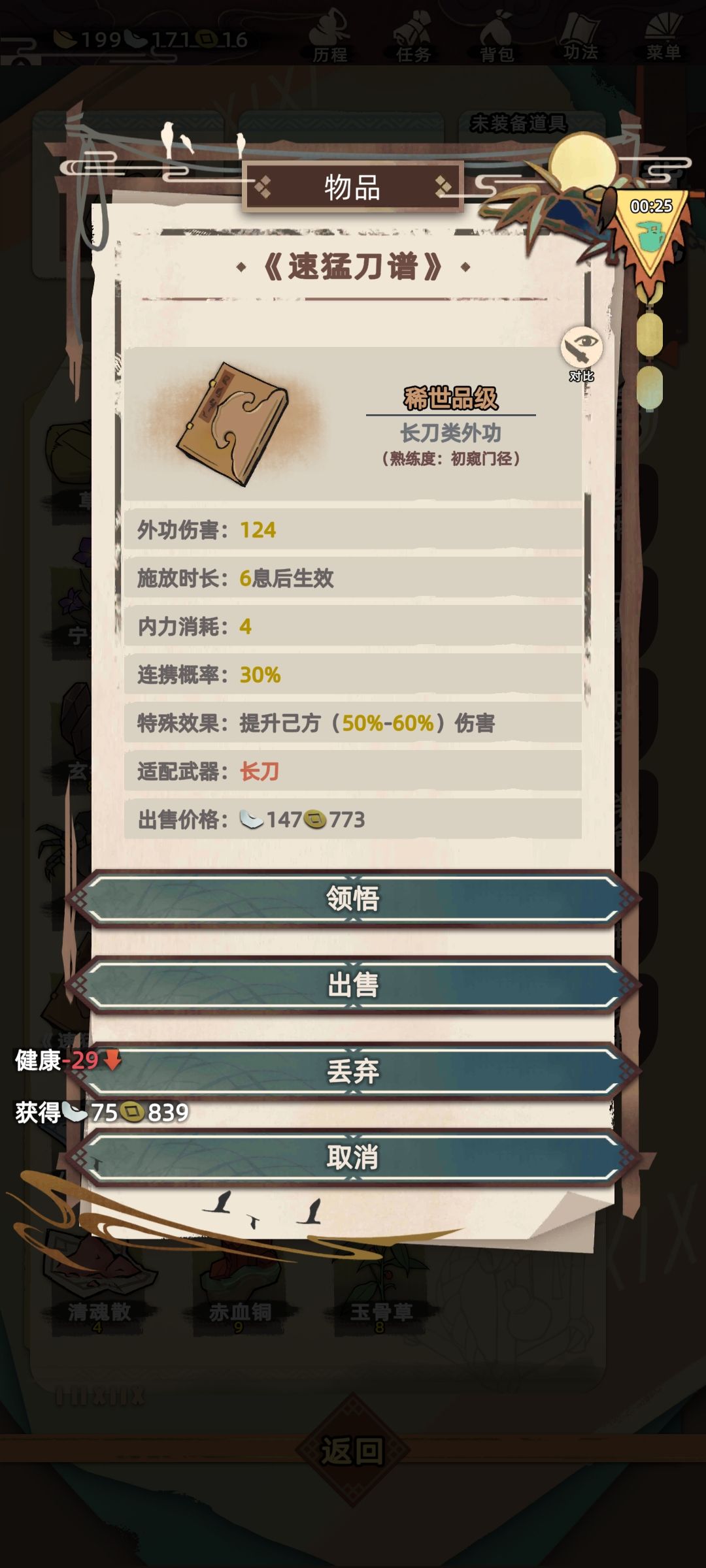 打败对方后可获得10-100不等银子,以及概率掉落秘籍或武器(我每次打了都掉,但不确定是不是百分百掉落),而且掉落的大都是高品阶,卖出去能赚一两百银子。