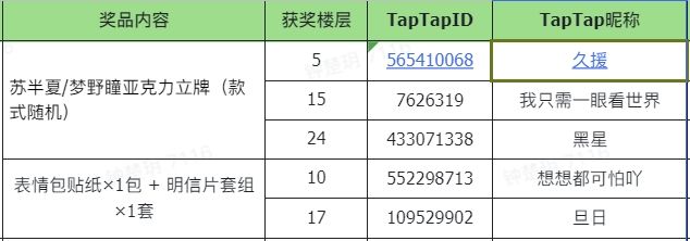 感谢大家,截至2023年8月25日23:59共有27楼成功参与,现根据评论区综合评选结果,恭喜以下幸运小伙伴获奖~请于2023年9月4日23:59前加入《不存在的谎言》手游官方1群519900748,并主动联系管理员3007958023提供TapTap个人主页截图登记领取奖品,逾期将不再发放。