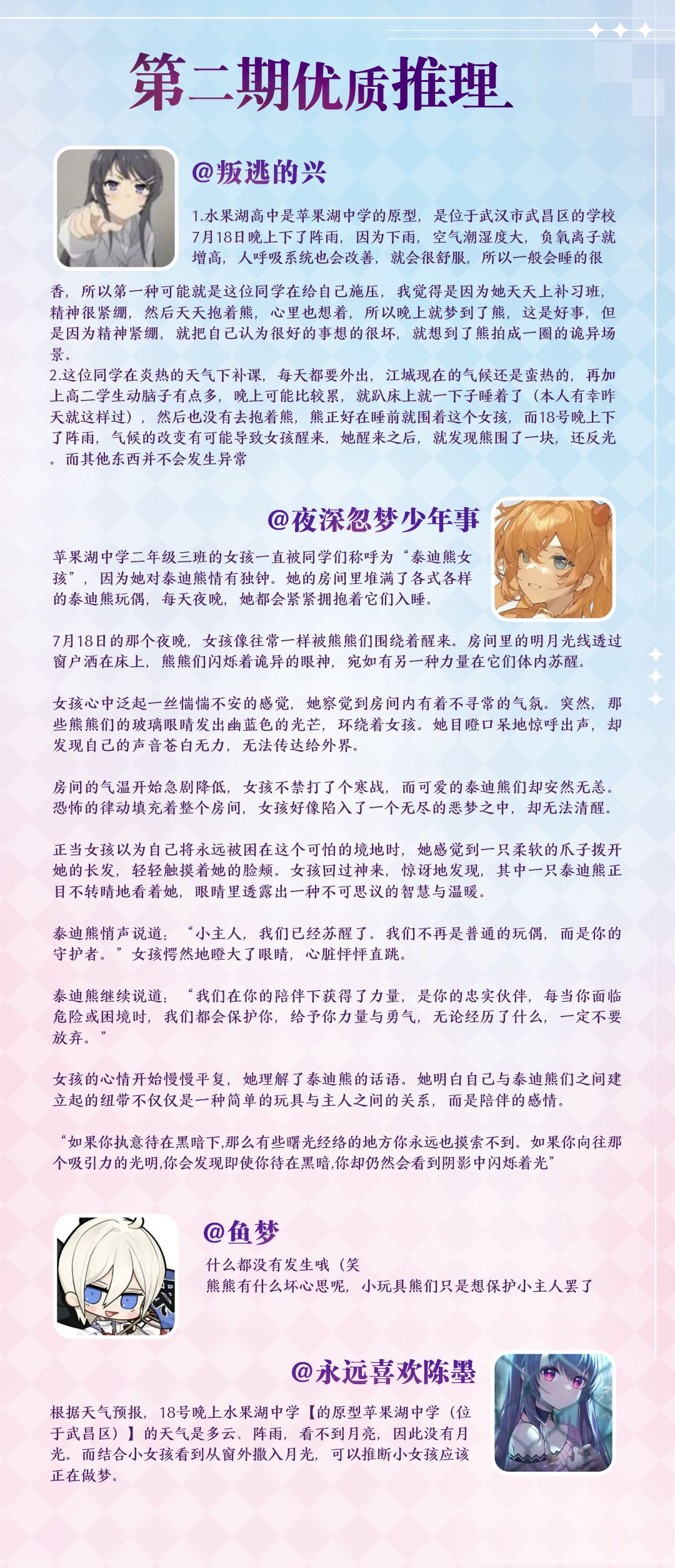 当然还是老规矩,优秀的推理答案小瞳会pick做好摘录,并且会给做出优质推理的社员送出不谎的周边哦~