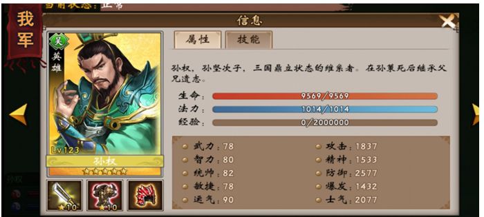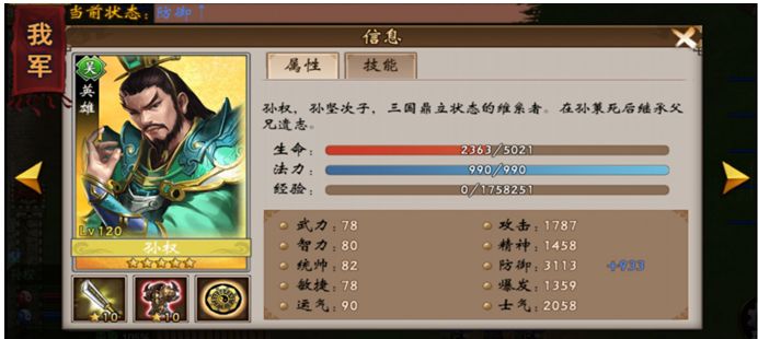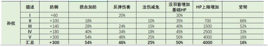 1星的坚甲皮肤,基础特性是防御+60,进阶特性是损血加防,和加更多的防御力。大部分武将这个损血加防没啥用的,因为我方血量很少,加防也加不了多少,但孙权不同,或者说现在的孙权不一样了,后期他的血量是非常非常高的,损血加防配合减伤,物理攻击对他的伤害会非常低。