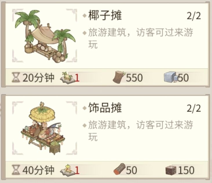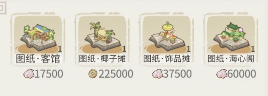 海岛商铺2级:1.25万沙子、500梨花木、300花岗