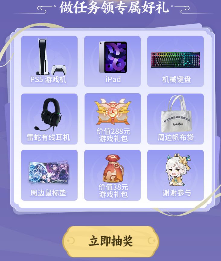 在活动页面完成相应任务即可获得抽奖资格,PS5、ipad、机械键盘、雷蛇耳机、限定周边还有游戏礼包,邀请好友还能获得更多抽奖机会哦~