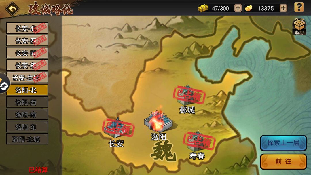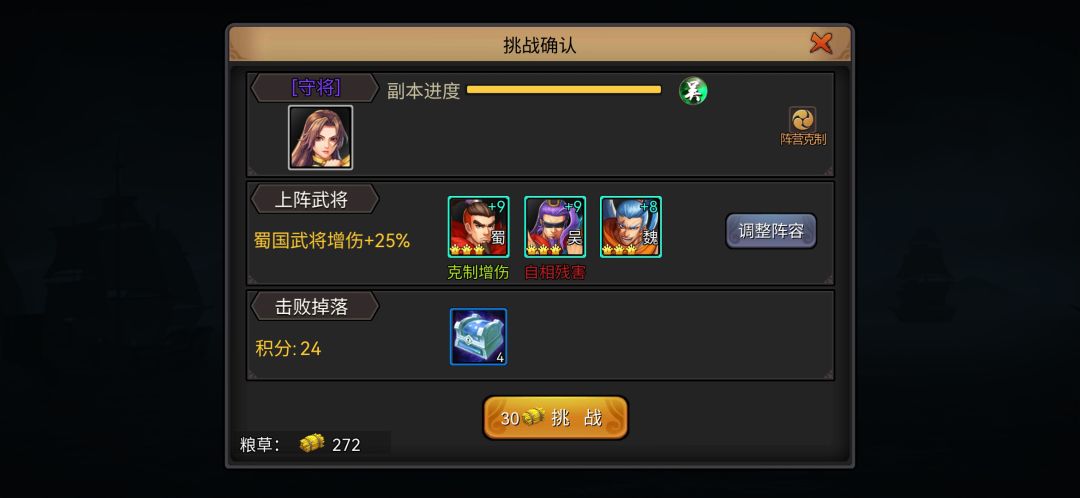 只需要入驻完关卡的驻扎点便可触发守关主将位置,击败守关主将就能开启下一关卡,不挑战关卡的普通和精英守关boss,这是最快速的通关捷径,但必然会错失普通和精英守将的挑战奖励。20个关卡七天时间,战力达标的情况下,不用购买太多粮草也能获取到较多的资源。