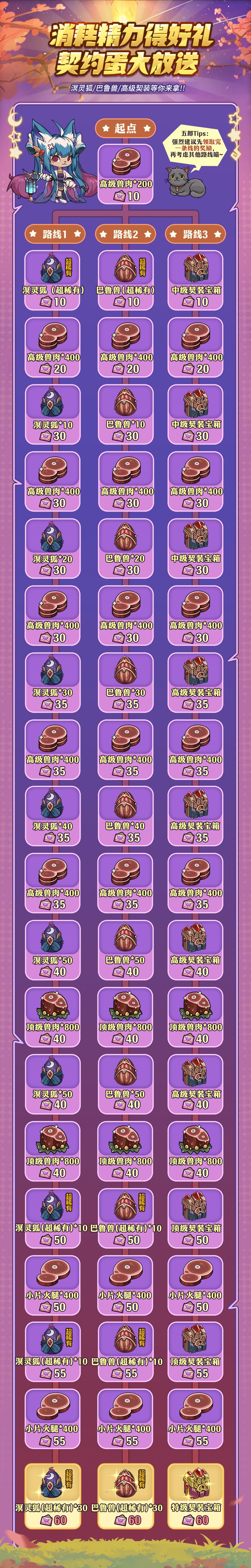 『消耗精力得好礼』活动正式开启!提灯者们将有机会从奖励路线中获得溟灵狐契约蛋、巴鲁兽契约蛋、契装宝箱~当然,还有不少香喷喷的兽肉,来帮助从蛋中孵化的契约兽快速成长!