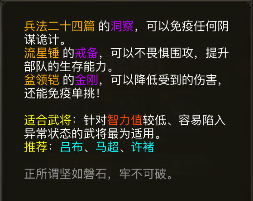 在有的战役中“洞察”配置给低智力的武将去贴面高智力的敌将时还可以骗取技能和回合数,让敌军原地罚站,丧失战斗力。更能完美配合“上将”技能带来的负面效果,堪称神技。