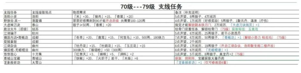 70级支线大多和镇派挂钩,一定要在68级前开始准备,提前准备好任务所需的材料,BOSS打不过不要紧,一定不能让支线的前置任务卡了进度。70 — 85级 属于开荒中后期阶段 主要是获取野外镇派,野外秘技,橙装图纸。