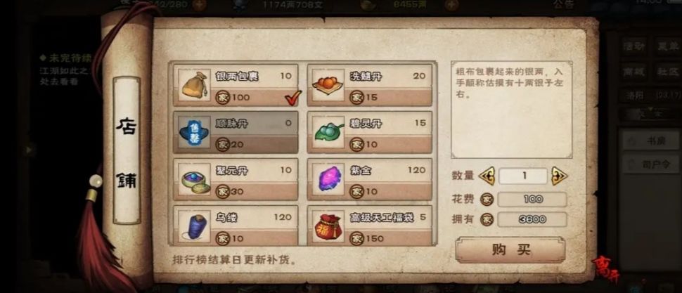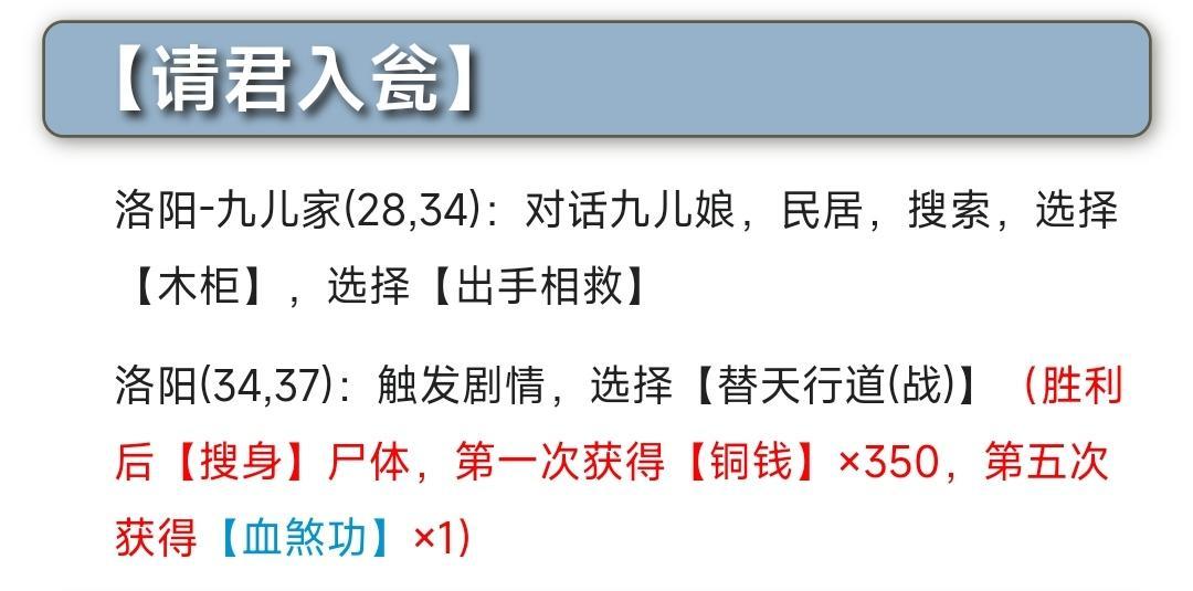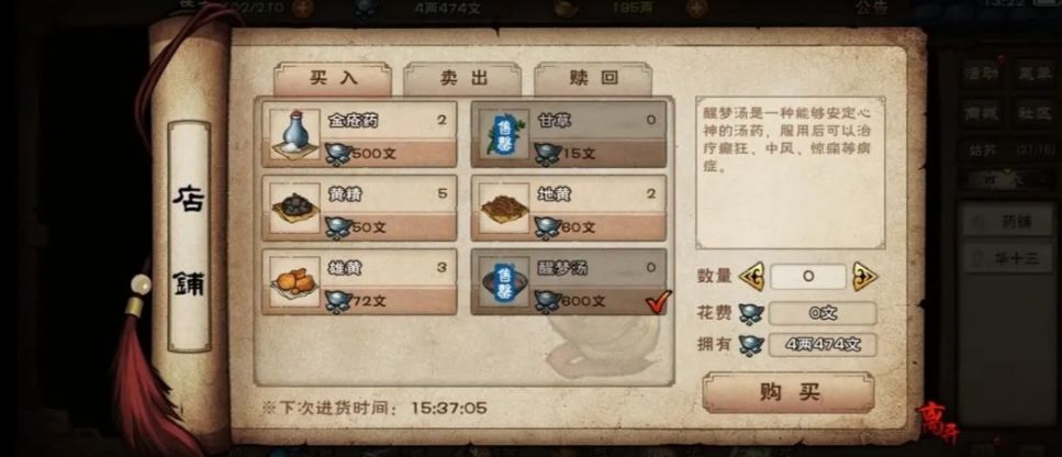 确定了后续升级方法,就可以着手准备继续推进主线任务,主线任务一定要推到打赢岳飞孤之后,推到后面救治需要醒梦汤,需求材料苛刻,所以这个主线要卡一段时间(姑苏药店在主线未完成期间会一直刷新醒梦汤,方便我们日后直接使用,所以要多攒一些,买12个即可)