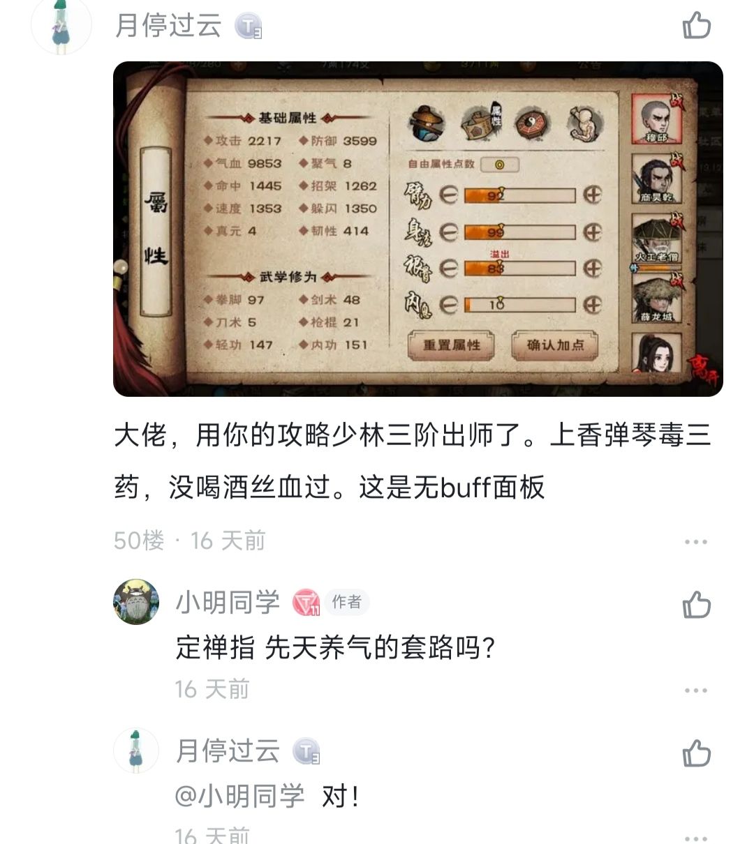 最后提一下:如果有人新区开荒,用定禅指+先天养气的套路成功三阶出师,请留下的你面板数据,感谢🙉(要16岁,岁数大了就没有参考价值了)