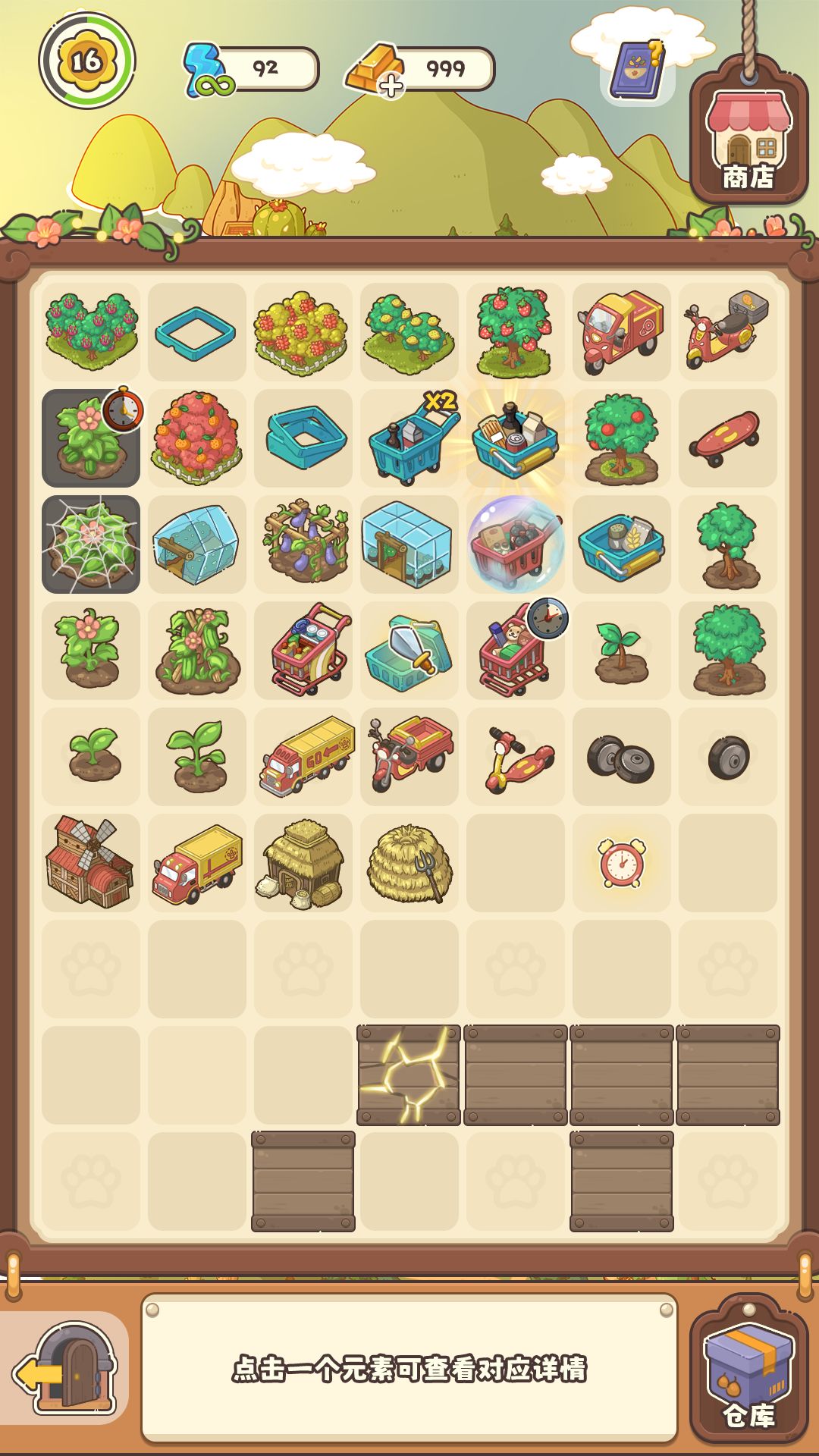 所有物品都有对应的等级,等级越高收获时获得的经验奖励越高,假如你想要一棵果树,就先得由两棵一模一样的种子合成小树苗,又由两颗小树苗合成果树,果树可以获得很多元素,比如:苹果、香蕉、葡萄等水果。