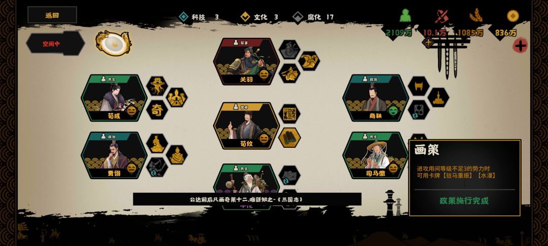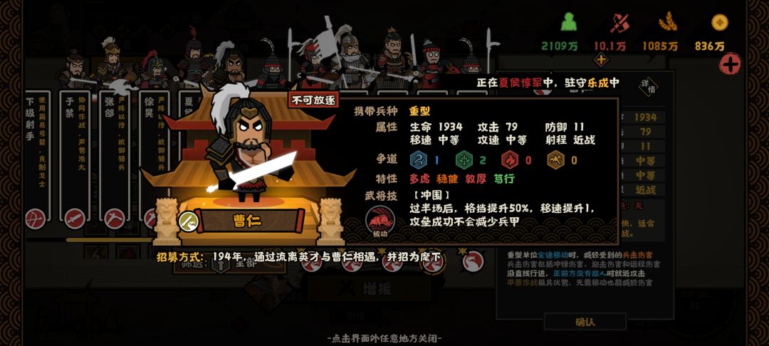 本来还在想能不能刷到十级,结果到八极就满了,后面几级在不增援的情况下都要打两次才升级,荀攸的驻马重振给车兵回血回特别多,从四级往后的战斗几乎都是1%战损(500-1000兵力)