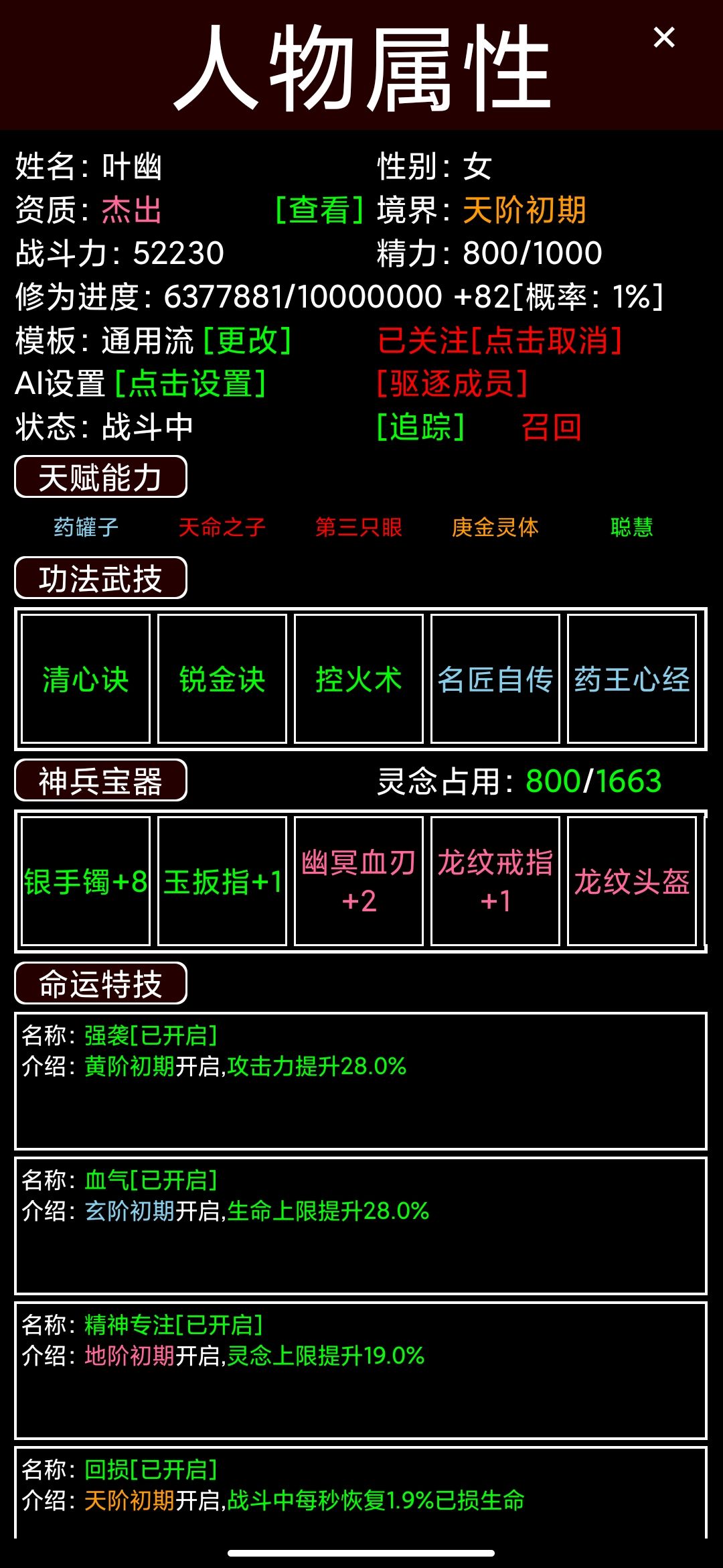四、天阶后把功法换成要用的(图1)。我这个帮众因为不用天阶装备,这1600灵念装上了22个装备。其中,地阶装备17个。